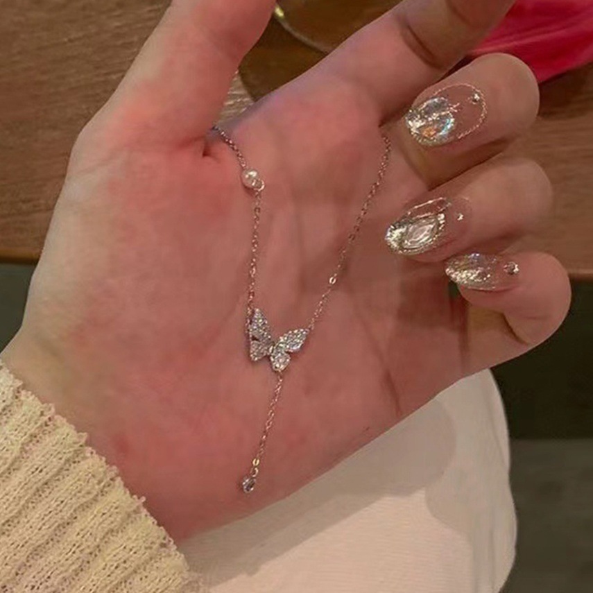 きらりと輝く蝶々のモチーフとチェーン部分のパールがアクセントとなった上品なネックレスです。